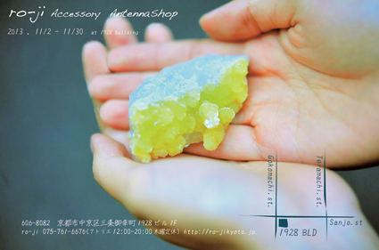 2013年4月16日〜4月21日 京都三条御幸町1928ビル1Fオープンしております期間限定ショップの隣のギャラリーコラージュにて 今までro-jiが作ってきたパーツ・プロダクト・サンプル・石・ビーズなどの素材の販売を致します。 京都三条御幸町南東角1928ビル1階 同時代ギャラリー