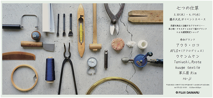 京都藤井大丸3階イベントスペースにて京都を拠点に活動するアクセサリー・革小物・テキスタイルなど7組のブランドによる限定ショップ